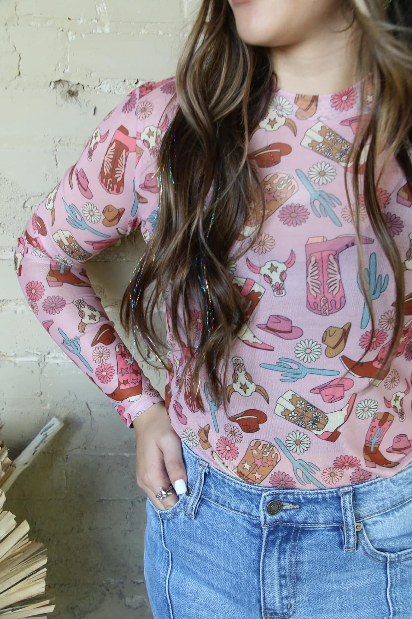 The Light Pink Western Mesh Top is a stylish and lightweight long-sleeve top featuring a detailed Western-inspired print. Made from breathable mesh fabric, this fitted top offers a comfortable stretch, making it ideal for layering or wearing on its own.