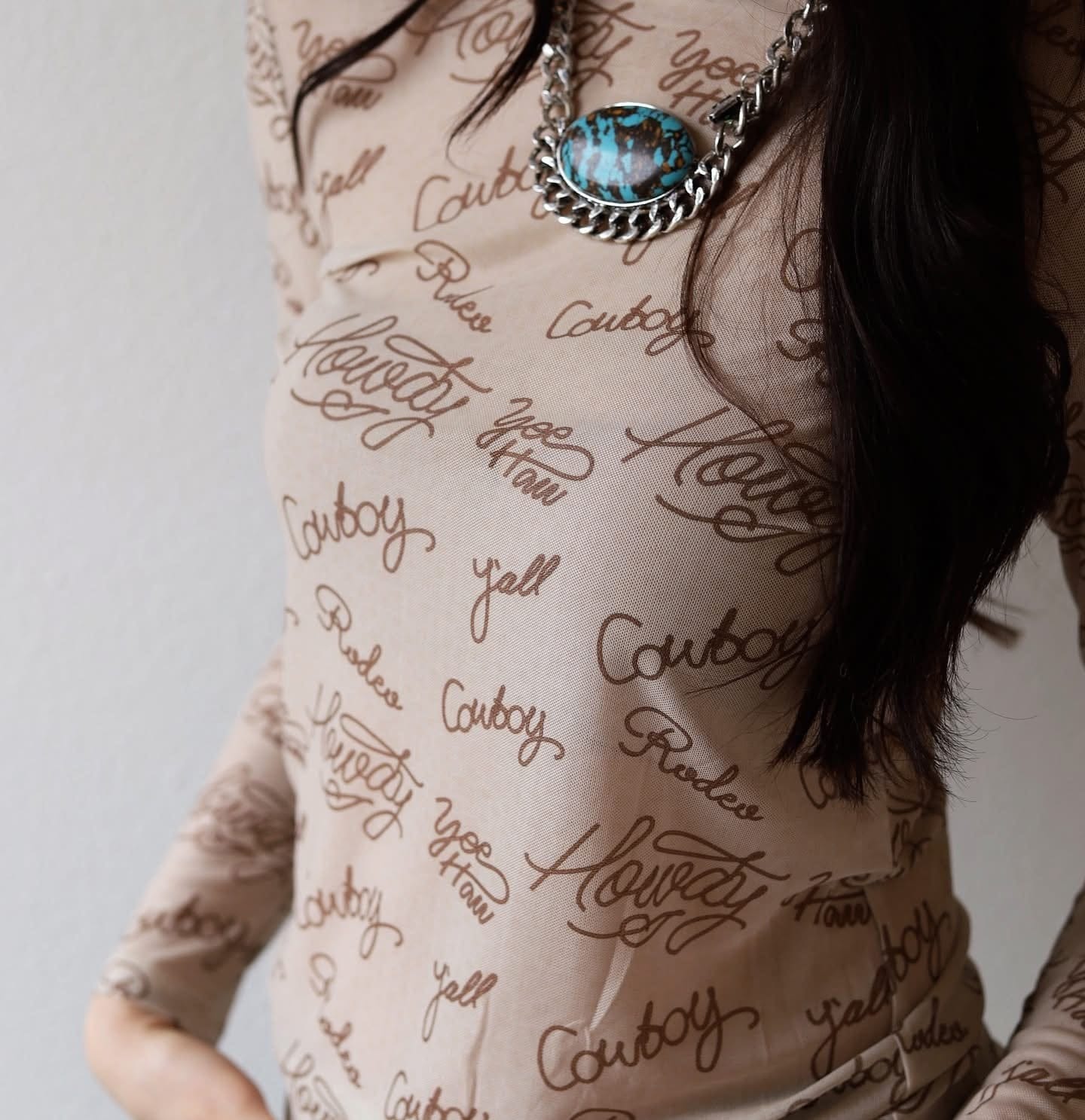 Say "howdy" to your new favorite layering piece! This sheer mesh top is covered in all your favorite western words—Cowboy, Rodeo, Yee Haw, and more—giving it the perfect blend of rustic charm and trendy style. With its lightweight, stretchy fit, it's perfect for layering or wearing solo when you want to make a statement.