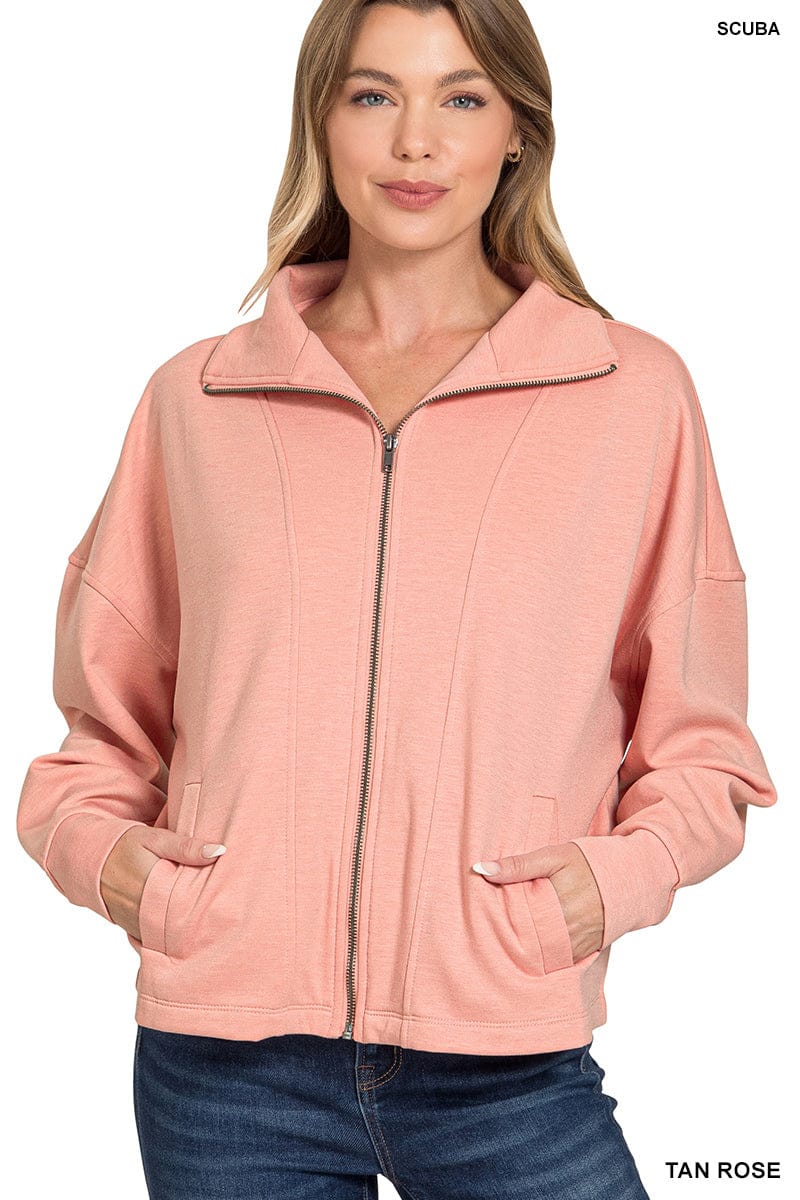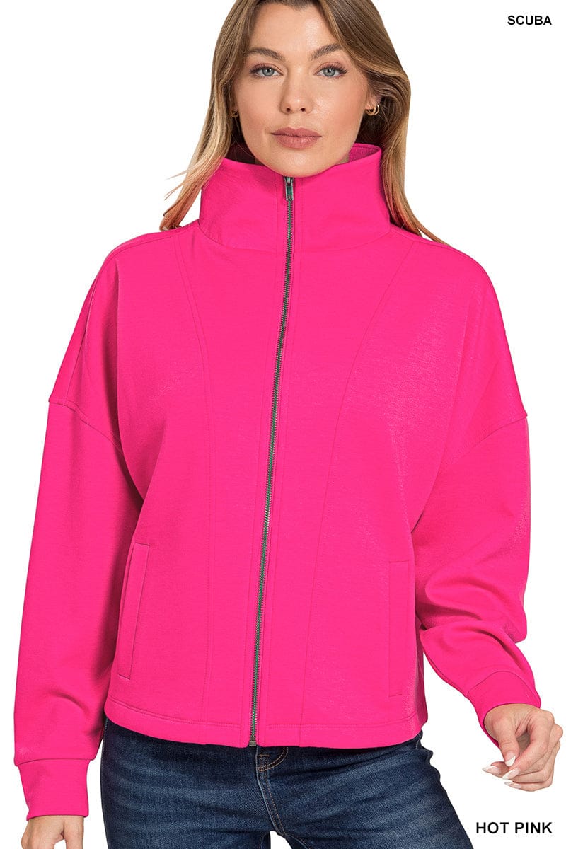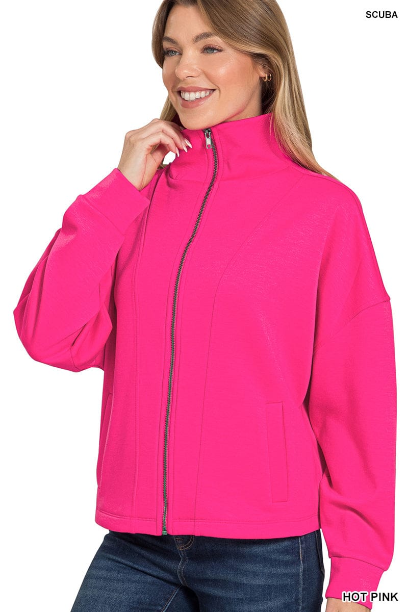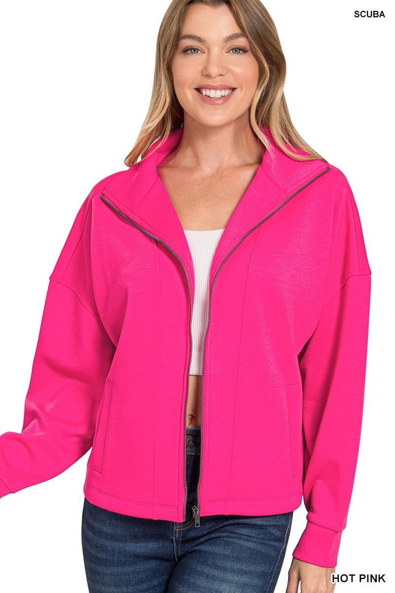 Smooth scuba knit and sleek mock neck make this oversized jacket a bright, wearable layering staple. Pair with leggings, jeans, or joggers for a casual look. Roomy fit, you can go true to size for relaxed fit or you can size down one for a more tailored fit.